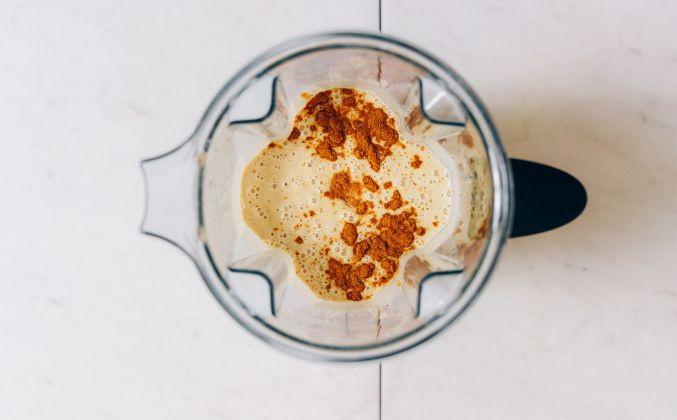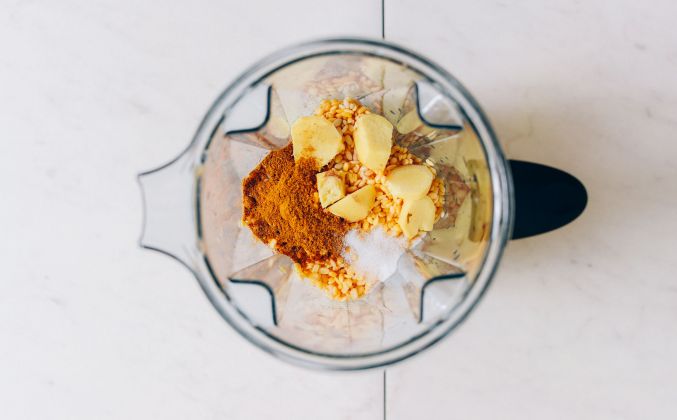 После замачивания хорошо процедите и промойте, затем перенесите рис и мунг дал в высокоскоростной блендер с солью, очищенным имбирем, порошком карри, кленовым сиропом и достаточным количеством воды, чтобы просто покрыть рис и чечевицу.