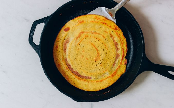 2. Смешайте на высокой скорости в течение 1 минуты или до получения кремообразной и однородной консистенции, при необходимости соскребая по бокам чаши блендера. Тесто должно быть жидким и текучим, как тесто для блинчиков, не водянистым, но не слишком густым или трудно наливаемым. Добавьте больше воды по мере необходимости для достижения правильной консистенции. Попробуйте и отрегулируйте вкус по мере необходимости, добавив больше соли по вкусу, имбирь для острого имбирного вкуса, порошок карри для более заметного вкуса карри или кленовый сироп для тонкой сладости или чтобы сбалансировать вкусы. Необязательно : для ферментированной версии дайте тесту отстояться при комнатной температуре в течение ночи (или не менее 6 часов). Должны появиться пузырьки, и тесто должно стать светлее / пышнее по текстуре, что указывает на брожение.