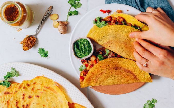 Простой, вдохновленный взгляд на классические индийские рисовые блины Доса - несладкий дал и рисовый креп, который идеально подходит для наполнения запеченными овощами, особенно картофелем! Подавать с зеленым чатни для еще большего аромата. Идеальный обед, закуска или средство для заворачивания дерзких блюд!