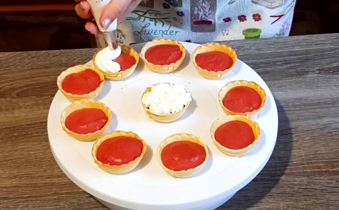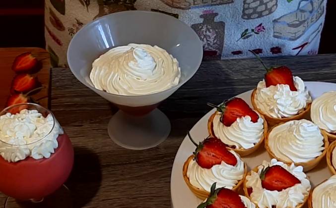 3. Корзиночки заполнены. Также курд можно подавать в креманках или бокалах. Теперь все это охлаждаем в холодильнике и затем уже подаем гостям. Курд я хочу украсить взбитыми сливками так как клубника со взбитыми сливками - это как известно классика. Для этого в чашу я вылила хорошо охлажденные сливки и начинаю их взбивать. затем добавляю сахарную пудру и продолжаю взбивать. Сливки перекладываю в кондитерский мешок и украшаю наши пироженки. Клубникой украшаем пирожные уже непосредственно перед подачей гостям.Видео рецепт ютуб ниже 👇