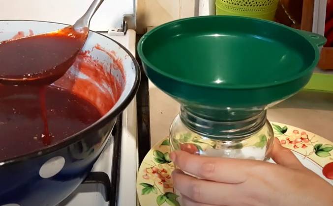 3.  Следите, чтобы джем не подгорел. Итак пять минут прошло и джем готов. Можем его закатывать в банки, у меня уже стерилизованные и крышки подготовленные. Баночку сразу же закручиваем. Из данного количества продуктов у меня получилось две такие пол литровой баночки, одна баночка чуть-чуть меньше, чем пол литра и поэтому то, что не влезло, я переложила в пиалку и посмотрите, джем остыл и какой он густой! Вот такой чудесный джем буквально за 20 минут можно сварить!Видео рецепт ютуб ниже 👇