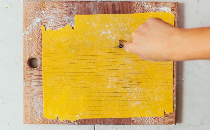 3. Используйте нож для пиццы или острый нож, чтобы нарезать макароны на полоски шириной примерно 1 см (или другой желаемой формы - просто нарезайте как можно более равномерно, чтобы обеспечить равномерное приготовление).