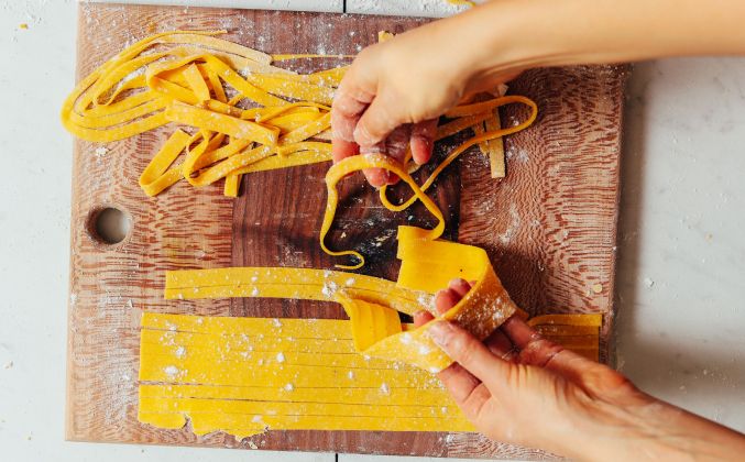 4. Пасту нарезают соломкой с большим количеством крахмала из тапиоки или без глютена, чтобы предотвратить прилипание. Затем аккуратно отложите и повторите этот процесс со второй половиной теста для макарон.