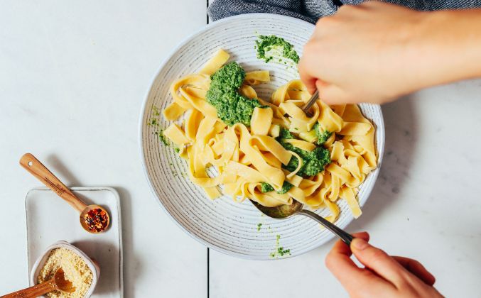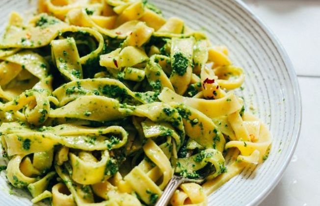 5. А пока доведите до кипения большую кастрюлю с водой. Хорошо посолите воду, затем добавьте макароны и варите 5-7 минут или до состояния аль денте. Слить воду и подавать с нужным соусом. Мы использовали наш веганский песто. Украсьте хлопьями красного перца и / или веганским сыром пармезан, чтобы еще больше поднять макароны на новый уровень.