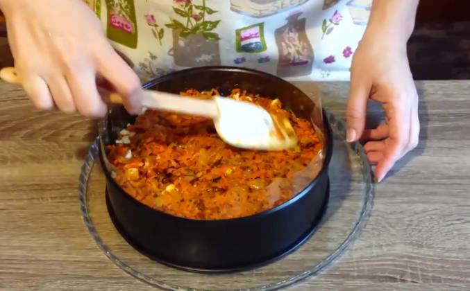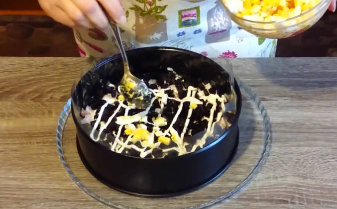 3. И так как в моркови присутствует масло, то этот слой я майонезом не промазывала. Хорошо распределяю и утрамбовываю, чтобы салат наш держал форму, обязательно все слои хорошо утрамбовывайте. Морковь посыпаю луком и наношу майонез и верхним слоем у нас идет сыр. Теперь салат накрываю крышкой, отправляю его в холодильник и даю пропитаться минимум 2 часа. Из редиски вылезают цветы. Итак салат хорошо пропитался, можем теперь его украшать. Из укропа и кукурузы я сделала мимозу, а из редиски - тюльпаны.Видео рецепт ютуб ниже 👇