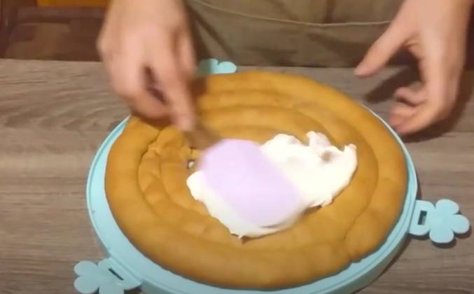 3. Так формирует 3 коржа. Вот так вот выглядят готовые коржи конечно же им необходимо дать полностью остыть. Теперь приготовлю крем. Здесь используется крем самый обычный это сметана сахарной пудрой. Но сметана должна быть жирной и хорошего качества, только тогда она хорошо взобьётся и будет прекрасный крем. Добавляю сахарную пудру, здесь же у меня и ванилин, немного размешаю и взобью. Крем готов. Черный шоколад я растопила в микроволновке импульсами по 10 секунд, каждый раз хорошо перемешивая. поместила его в кондитерский пакетик, сделала небольшое отверстие и нарисую цветы. Отправляю их в холодильник, чтобы они охладились и стали твердые. Когда коржи полностью остыли, можем продолжать собирать торт.