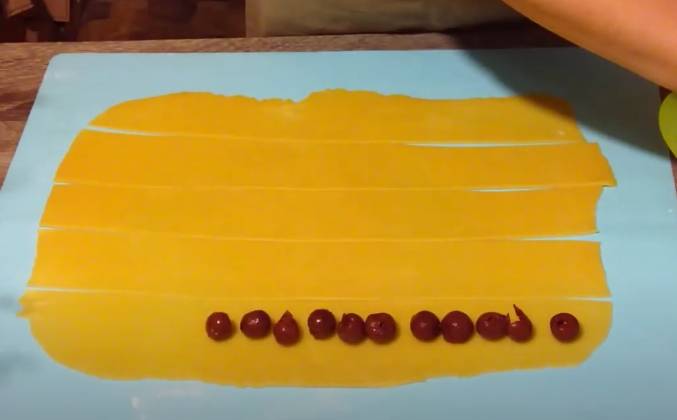 2. Также просеиваю и разрыхлитель и постепенно замешиваю тесто. И затем, когда тесто стало уже теплым, можно вымешивать его руками. Тесто я вымесила, а теперь миску накрываю пищевой пленкой и отправляею в холодильник на один час. Когда тесто охладилось, разделяю его на 3 равные части. Можно воспользоваться весами, потому что здесь желательна точность. И теперь рабочую поверхность присыпаю мукой и раскатываю одну часть тесто в прямоугольный пласт. Тесто я раскатала очень тонко и разрезала его на 5 равных полос, теперь выкладываю вишни, они у меня были в собственном соку, сок я слила и вишни хорошо отжала. Выкладываю их в ряд и теперь защипываю края. Формируем такую трубочку. Трубочки я сформировала и теперь буду выкладывать их в форму, которую я застелила пергаментной бумагой и смазала сливочным маслом. Выкладываю начиная от края и оставляю небольшие зазоры. Отправляю в духовку разогретую до 190 градусов.