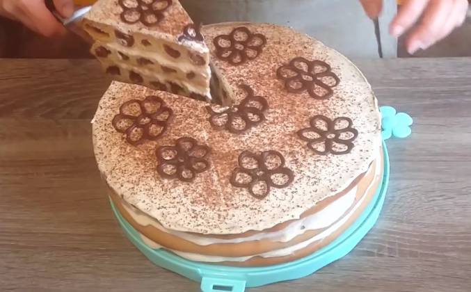 4. Выкладываю первый корж и смазываю его кремом, крема наношу достаточно толстым слоем. И третий корж я укладываю нижней частью вверх и смазывал остатками крема. Верх торта я выравниваю, а бока я оставлю вот такие вот как они есть, сейчас по новой моде это как раз в тренде :) И теперь торт отправлю в прохладное место, чтобы он хорошо пропитался и охладился. Прошла ночь, торт хорошо пропитался и можем продолжить его украшать. Как обычно украшения - это фантазия каждой хозяйки, у меня в этот раз будет достаточно простое, я просто натру сверху черный шоколад, делаю легкую крошку. Теперь я достала из холодильника цветы, они хорошо застыли и очень легко отходят от пакета. И украшаю цветами наш торт. Затем слегка их вдавливаю, чтобы они были закреплены. И вот такой торт у меня получился!Видео рецепт ютуб ниже 👇