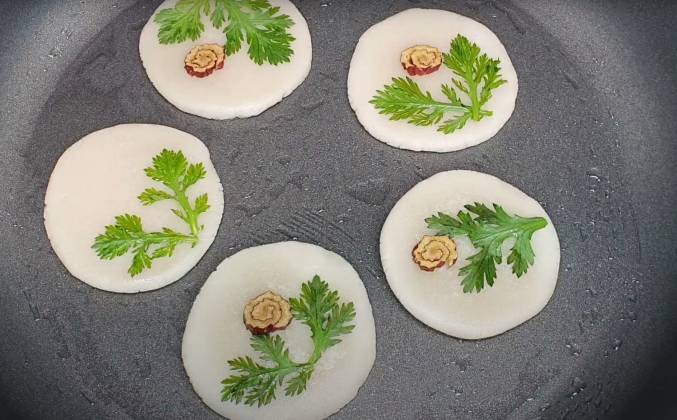 Как сделать Корейские оладьи десерт из рисовой муки ХВАЧЖОН. ХВАЧЖОН ( хвачон, хваджон) - сладкий корейский десерт из рисовой муки с цветком и сахарным сиропом. "Хва" переводится как "цветок". У нас не было съедобных цветков и мы украсили так, как это делается на экзамене на повара корейской кухни. Для украшения используют листья златоцвет (ссуккат) и китайский финик.
