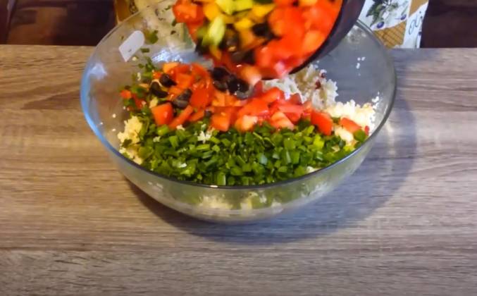 2. Хорошенько все размешиваем, чтобы заправка стала однородной. Можно также добавить буквально чайную ложку меда, если заправка по вашему вкусу слишком кислая. Теперь нарезаю огурец, огурец нарежу таким вот кубиком, не слишком мелким, но и не слишком большим. У меня осталя небольшой кусочек салатного перца и я его также порежу кубиками. Если у вас нету перца ,то в общем то его использовать не обязательно, можете добавить больше огурчика или помидора, или оливок. Черные оливки без косточки я также разрежу на четыре части. Теперь также кубиком нарезаю помидоры. И также нарезаю достаточно большой пучок зелени.