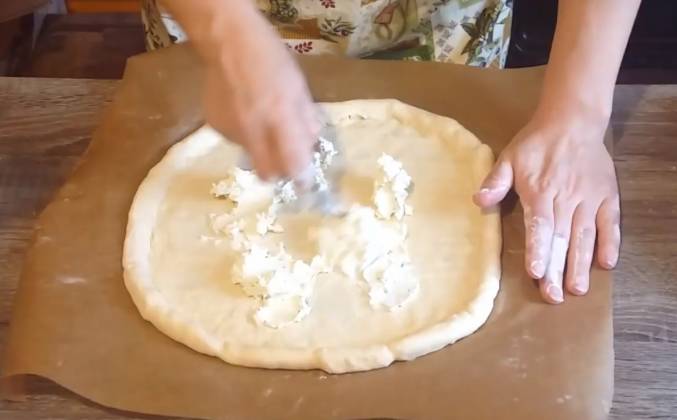 2. Тесто я хорошо вымесила, миску смазываю небольшим количеством растительного масла, выкладываю тесто, накрою его влажным полотенцем и поставлю в теплое место, чтобы оно выросло. И для начинки я буду использовать четыре вида сыра - это сливочный сыр с травами, моцарелла, любой сыр с плесенью и вот такой вот сыр у меня называется Рамзес. Конечно в идеале это пармезан, но пармезан я не нашла у нас магазине. Вы можете взять любой твердый сыр. Моцареллу я нарежу на брусочками, а этот сыр натру на крупной терке.Этот буду ломать кусочками, ну а этот будет идти как сливочный соус. Итак все подготовлю. Тесто у меня хорошо выросло, я его обмяла и разделила на две части. Раскатывать тесто я буду на пергаментной бумаге, присыпаю ее мукой и выкладываю тесто и сначала руками формирую лепешку. И при помощи скалки раскатываем в тонкий круг.