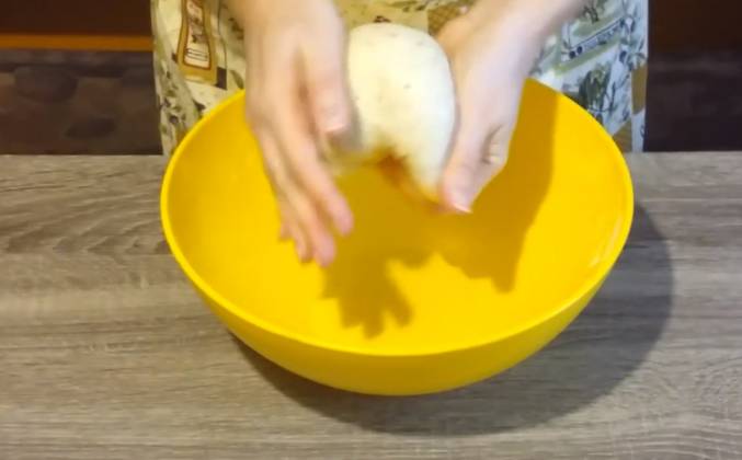 2. Сначала аккуратно попробуйте тесто, чтобы вы не обожглись, так как заваривали мы его практически кипятком, и теперь наша задача хорошо вымесить тесто до однородного состояния. Тесто я хорошо вымесила, оно совершенно не липнет к рукам и очень мягкое. Теперь я его перекладываю в пакет и оставляю, чтобы оно отдохнуло примерно от получаса до часа. Прошел час, тесто наше отдохнуло, еще раз его обомну и разделю на равные кусочки. Теперь поверхность смазываю небольшим количеством растительного масла, также смазываю скалку и раскатываю лаваш. Необходимо раскатать как можно тоньше.