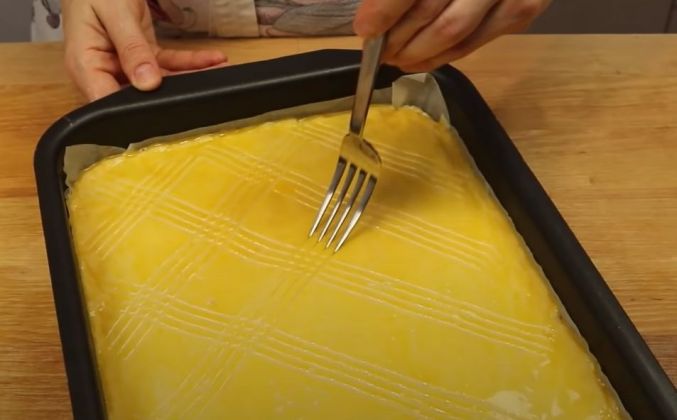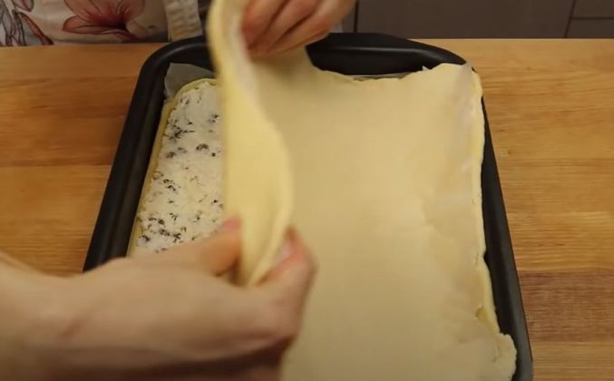 2. Делю тесто на две половины: одну прячу в полиэтиленовый пакет и убираем в холодильник. Форму для пирога беру размером 30 на 22 сантиметра, если у вас круглая, то диаметр примерно 28 сантиметров. Форму застелила пергаментной бумагой, теперь на этой бумаге раскатываю оставшуюся половину теста. Если тесто прилипает - присыпайте мукой. Переношу в форму - должна получиться основа пирога, с небольшими бортиками. Пальцами немного еще разравниваю, убираю в холодильник.
