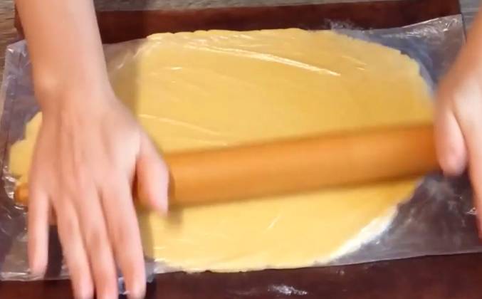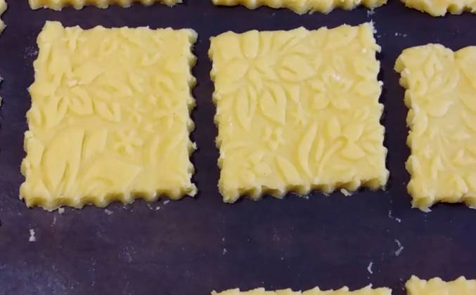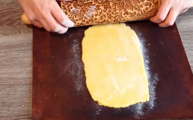 3. Для присыпки я буду использовать рисовую муку Аккуратно и распределяю, выкладываю тесто и буду раскатывать его через пакет. Можно также использовать пищевую пленку. Вот такой пласт толщиной полсантиметра у меня получился. И сегодня я тестирую вот такую скалку. Это новинка! Такой себе кухонный гаджет) Слегка присыплю тесто мукой, слегка придавливаю и аккуратно провожу. И вот такой рисунок на тесте получается. Теперь с помощью такого ножа нарезаю печенье. Остатки теста я снова раскатала в пласт, присыпаю мухой. Не стоит раскатывать слишком тонко чтобы тесто не прилипало к скалке, примерно пол сантиметра не меньше. Слегка прижимаю и провожу. Вот такая красота! Очень красивый рисунок, только надо приспособиться и надо обязательно присыпать поверхность мукой, чтобы скалка не прилипала.