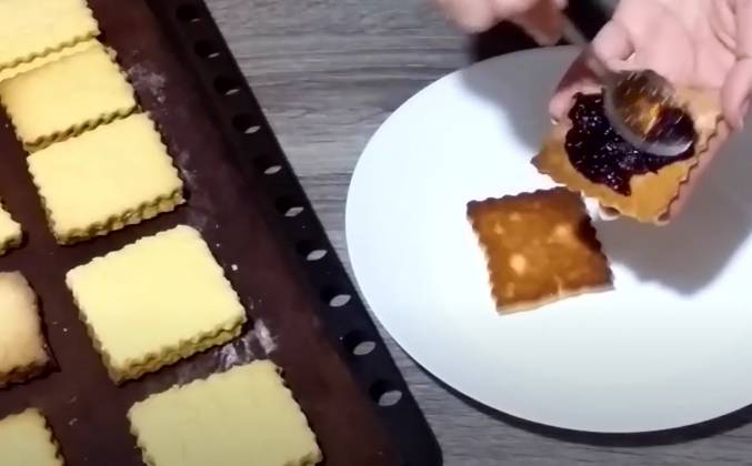 4. Печенье выпекать в духовке, разогретой до 180 Печенье готово! Я дала ему полностью остыть, потому что в горячем виде оно очень крошится. Очень мягкое и рассыпчатое, невероятно вкусное и ароматное! Можно конечно же его кушать и в таком виде, но я хочу приготовить из них пирожные. Для этого я подберу примерно одинаковые печеньки и вот так вот буду выкладывать их. Это у меня джем, он достаточно густой, он из алычи и довольно кисленький, к такому сладкому печенью как раз хорошо подойдет. Наношу на одну половинку джем и накрываю второй половинкой. Так собираю все пирожные. Теперь пирожным даем 6-8 часов, чтобы они пропитались и только тогда их будем кушать.Видео рецепт ютуб ниже 👇