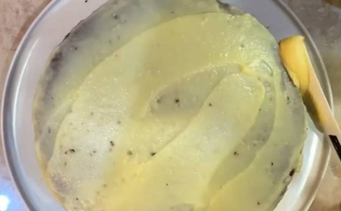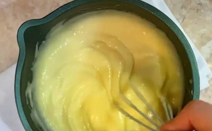 3. Как только заварной крем загустеет и начнет закипать, снимаем с плиты. В горячую заварную массу добавляем мягкое сливочное масло, размешиваем до полного растворения сливочного масла. Крем накрываем пищевой пленкой так, чтобы пленка легла прямо на его поверхность (чтобы не образовалась пленка при остывании).