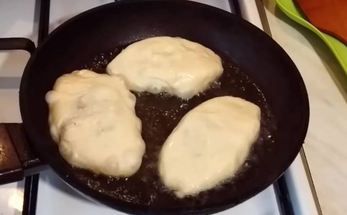 4. А остальные я буду жарить. Буду начинать с первых, они уже немного подросли и их можно готовить. Сковороду я хорошо разогрела и наливаю растительное масло. Как мне сказали, растительное масло наливать один раз, пирожки впитывают его немного, поэтому добавление масла больше не понадобиться. При помощи лопатки проверяю разогрето ли масло. Видим, пошли пузырьки, значит масло готово для жарки. Пирожки выкладываю швом вниз. Таким образом они не будут растрескиваться. ж Жарю на среднем огне. Пирожки снимаю на бумажное полотенце. Пока пирожки обжаривались, кого эти как раз за это время очень хорошо подросли. Я их смазываю крепкой чайной заваркой, чтобы ради четырех пирожков не использовать яйцо. Чайная заварка также подходит для смазки пирожков. Выпекать в духовке при 180 градусах. Уже и эти пирожки готовы! они очень хорошо подросли, видно, что они очень мягкие и пушистые. Надо теперь подождать когда они остынут и я один пирожок разорву и покажу какой он будет внутри.