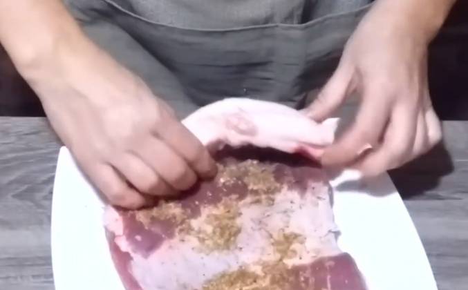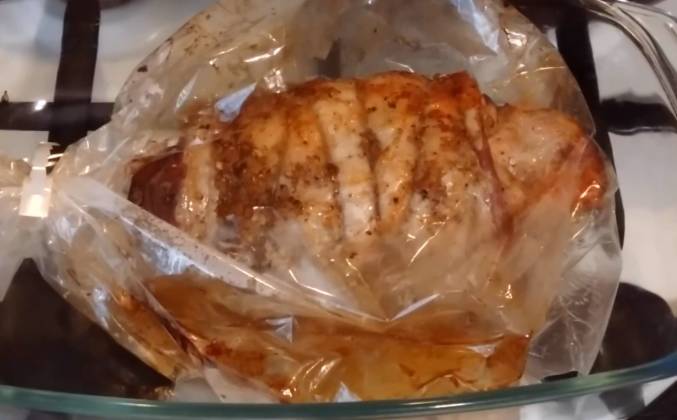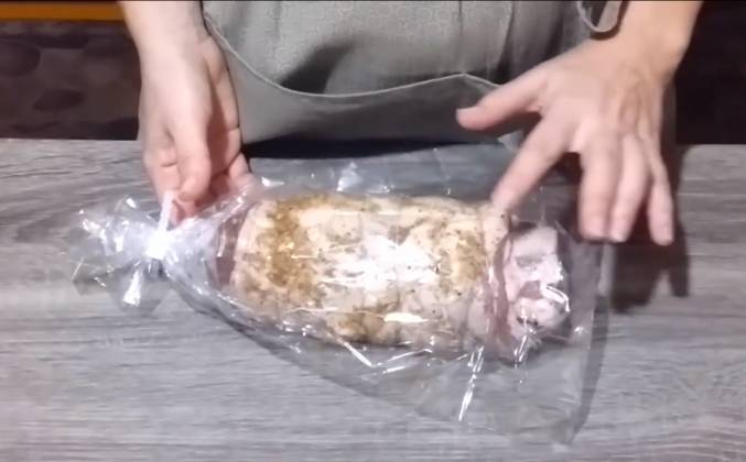 2. Перетяну натуральной нитью. Вот такой рулет у меня получился. Теперь я его помещаю в пакет для запекания и в таком виде отправляю в холодильник на 8-10 часов, чтобы он хорошо просолился и пропитался специями и конечно же он уже будет готов к запеканию. Прошло 10 часов и теперь рулет можем запекать в духовке, разогретой до 180 градусов. И не забудьте сделать небольшие отверстия, буквально несколько штук, а теперь в духовку.