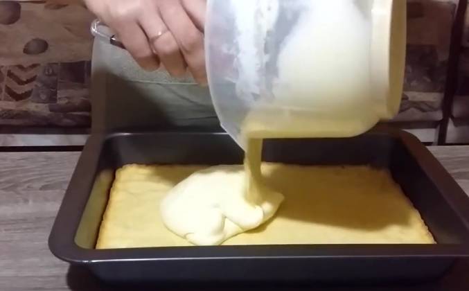 2. Теперь одну четвертую часть теста я отделяю и убираю в морозильник, а эту часть распределяю на противень. Вот такой коржик должен получиться. Теперь я его покрывают пищевой плёнкой в контакт и убираю в холодильник примерно на полчаса. Прошло пол часа, тесто охладилось и я отправляю его в духовку разогретую до 180 градусов, чтобы оно слегка подзолотилось. Корж подрумянился и теперь ему необходимо полностью остыть. Когда корж полностью охладился, начинаем делать крем. Для этого в белки добавляю лимонный сок и начинаю их взбивать, постепенно всыпая сахарную пудру продолжаем взбивать. И теперь очередь пудинга, постепенно его всыпаю и продолжаю взбивать. И в конце вливаю растительное масло. Вот такой крем должен у нас получится.