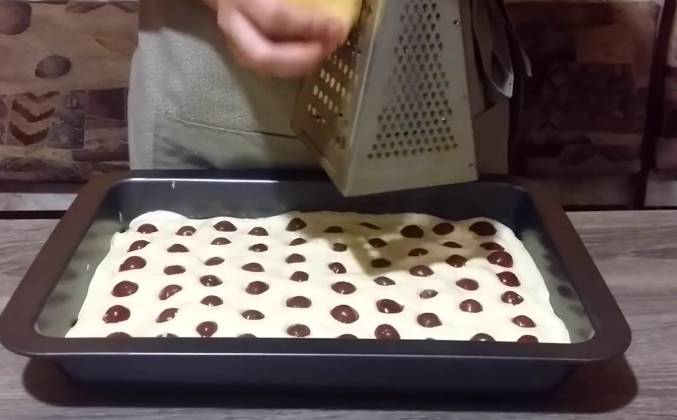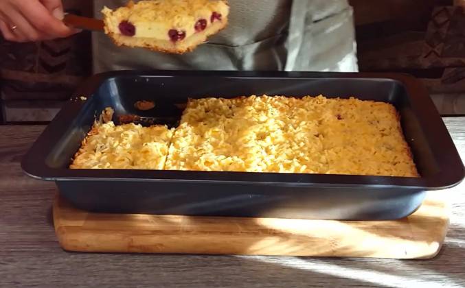 3. Теперь крем распределяю по коржу, раскладываю вишню. Вишни у меня в собственном соку, я откинула их на дуршлаг, чтобы стекла лишняя жидкость. И сверху натираю замороженное тесто. Отправляем пирог в духовку, разогретую до 180 градусов. Верх должен хорошо подзолотиться. Пирог готов! Теперь ему необходимо полностью остыть и только тогда его можно разрезать.Видео рецепт ютуб ниже 👇