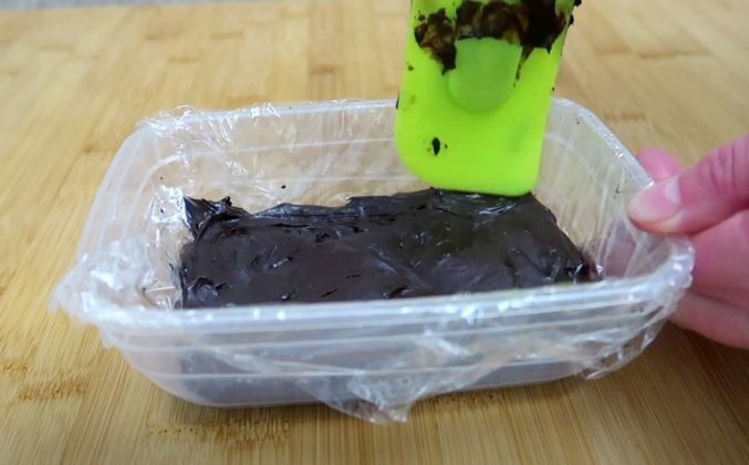 2. Миску застелим пищевой пленкой и выкладываем смесь. Смесь получается густая и тяжело распределить по форме. Накрываем плёнкой, отправляем в холодильник на 2-3 часа, смесь застыла, рабочую поверхность присыпем какао.