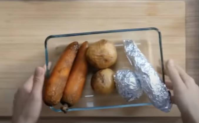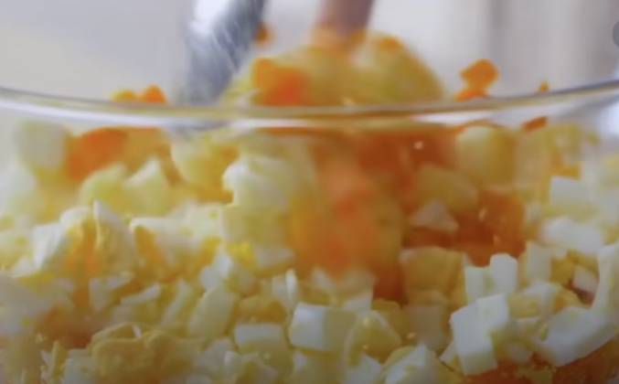2. Нарезать овощи, они такие вкусные, что просто все будут не мясо искать в этом оливье, а овощи. Обычно оливье кидают все, потом замешивают и теряется форма, потому что яйцо нежное, можно его размазать или получить не ту консистенцию, поэтому картошечку рекомендую вот так вот слегка по перемешать с морковкой, чтобы от кубика отошел, яйца их тоже нарезаем довольно таки крупно.