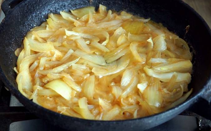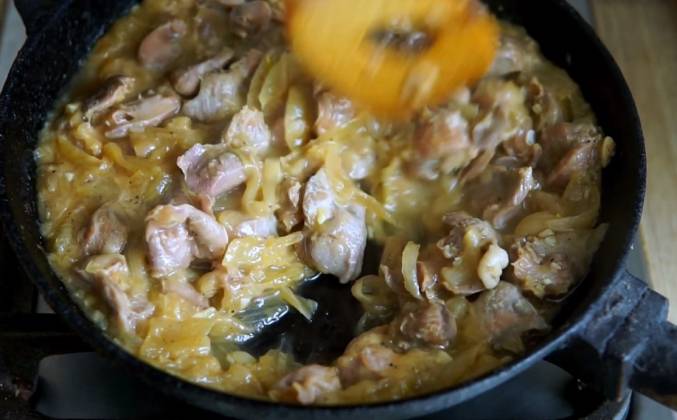 2. После испарения воды начнётся процесс карамелизации. Снова подливаю воду и перемешиваю. Повторяю этот процесс несколько раз до тех пор пока весь лук не поменяет свой цвет. Куриные желудки забрасываю в кипящую воду и отвариваю в течении десяти минут. Отваренные желудочки помещаю на сковороду с луком.