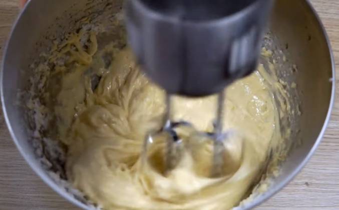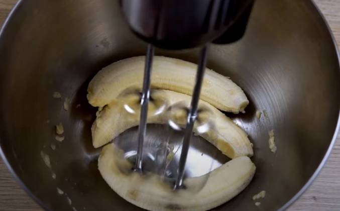 2. Венчики прекрасно режут бананы и вскоре они превратятся в пюре. Добавляю сахар. Три яйца. Яйца, сахар и бананы начнут взбиваться. Появится пена и тесто увеличится в объёме. Сейчас постепенно добавляю муку и продолжаю взбивать. Мука должна полностью соединиться с тестом. После муки добавляю разрыхлитель. Как только он растворился в тесте, сразу же, не выключая миксер, добавляю растительное масло. Буквально двадцать секунд нужно, чтобы оно полностью соединилось с тестом. Как только это произошло, сразу же останавливаю миксер.