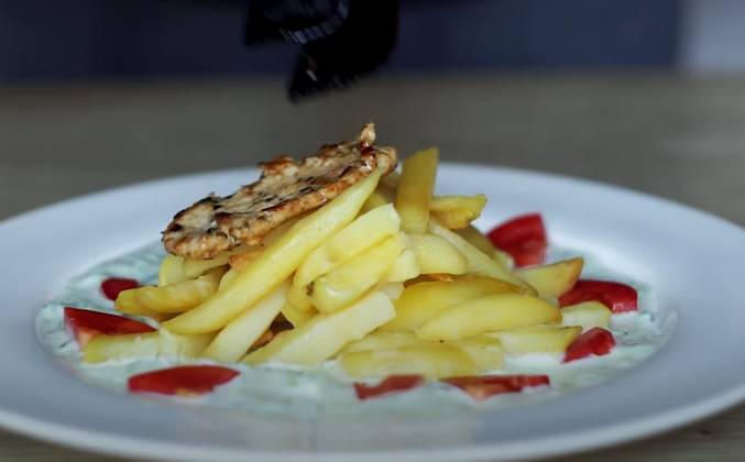 3. На сковороду наливаю масло. Кусочки мяса размещаю таким образом, чтобы они не касались друг друга. Ни в коем случае не жарю всё сразу. Примерно 3-4 минуты не переворачивая. За это время кусочки очень аппетитно поджарятся с одной стороны, и будут полностью готовы с другой за счёт тонкой нарезки. Тоже самое происходит и при приготовление шаурмы на вертикальном гриле. Одна сторона с корочкой, вторая без неё. Мясо при этом не кажется сухим на вкус. Всё что сейчас нужно, перевернуть кусочки на несколько секунд, хорошо перемешать и сразу же подавать. Лепёшка, непосредственно гирос, свежие помидоры и лук, картошка фри и соус Tzatziki.Видео рецепт ютуб ниже 👇