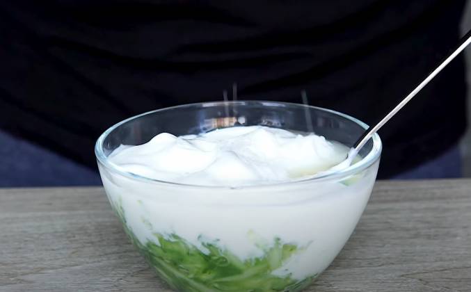2. Добавляю в маринад немного растительного масла. Перемешиваю, чтобы травы и масло полностью смешались с мясом. Так как кусочки тонкие, маринование мяса займёт 5-10 минут. За это время приготовим традиционный греческий соус с труднопроизносимым названием тзатзыки ( tzatziki ). Натёртый на крупной тёрке огурец, греческий йогурт, сок лимона, соль. Все перемешиваю до однородного состояния. При необходимости добавляю ещё соль, или лимонный сок.