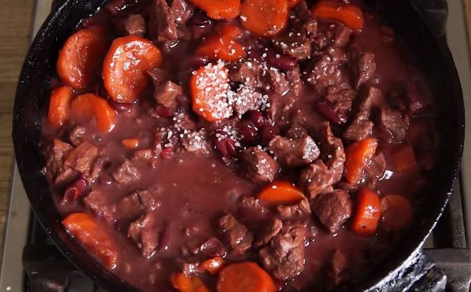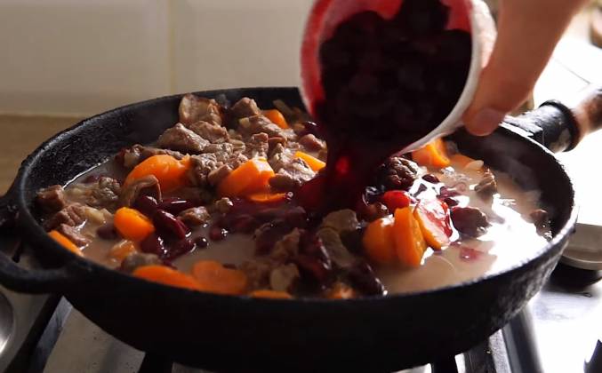 2. Добавляю морковь нарезанную крупными круглыми кусочками. Доливаю кипяток из чайника. Это консервированная красная фасоль. Её присутствие сделает любое мясное блюдо более сытным. Кроме того, крахмал, содержащийся в фасоли превратит жидкость в густой соус. Сейчас добавляю такое же количество вишни без косточек. Подойдёт, как свежая ягода, так и замороженная. Накрываю крышкой и оставляю тушиться полтора часа. Раз в 30 минут нужно проверяйте уровень жидкости, и долейте воду при необходимости.