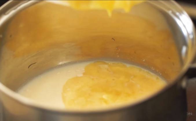 2. Вливаю смесь из желтков и сахара и начинаю непрерывно перемешивать. Крахмал в данном случае не только служит загустителем, но и не позволит желткам свернуться при кипении. Как только молоко хорошо нагреется, крем начнёт густеть прямо на глазах. Дождитесь кипения, добавьте кусочек сливочного масла и варите две три минуты при постоянном помешивании. Остывший крем еще сильнее загустеет и будет иметь очень приятную, можно сказать, шёлковую текстуру. Друзья, если однажды вы не найдёте скалку, не сдавайтесь! Её легко заменит трубка с пищевой плёнкой.
