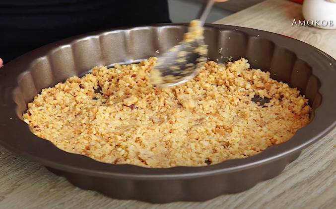 2. Основа чизкейка - уже готовое печенье. В домашней выпечке я принципиально против печенья из магазина. В конце видео я покажу французский рецепт песочного печенья, который готовится за 30 минут. Итак. Печенье ломаем и измельчаем. Здесь легко перестараться, по-этому лучше следить за тем, чтобы получилась именно крошка, а не пудра. К перемолотому печенью добавим растопленное сливочное масло и обычную воду. Нужно чтобы крошка начала склеиваться между собой. Это позволит без труда выстелить дно формы, сформировав тем самым коржик.