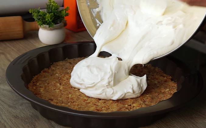 3. Предварительно выпекать его не нужно. Выливаем сверху творожный крем. Он достаточно жидкий, и сможет самостоятельно распределиться ровным слоем. В выпечке чизкейка есть один важный момент. На противень нужно налить стакан воды. Влажность в духовке поможет сырной основе пропечься равномерно. Выпекаем при температуре 140 градусов 60 минут. А сейчас французский рецепт простого домашнего песочного печенья.