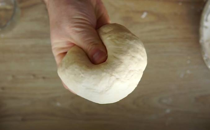 2. Соотношение муки и воды - два к одному не случайно. В зависимости от температуры и влажности мука возьмёт ровно столько воды, сколько нужно для теста идеальной консистенции. Оставшуюся часть муки можно использовать, например, для приготовления белорусского блюда Затирка. На вымешивание теста уйдет около пяти минут. В какой-то момент вы почувствуйте, как тесто изменилось. Оно перестанет липнуть к рукам и станет очень эластичным и податливым.