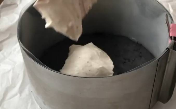 2. Легче всего это сделать мокрыми руками, а затем ложкой. ⠀ ⠀ Замочить листовой желатин в холодной воде. Затем хорошо отжать его. ⠀ ⠀ Крупно порубить печенье OREO (14 шт). ⠀ В сотейнике смешать 150 г сахара и 50 г сливок. Поставить на средний огонь и дождаться пока сахар полностью растворится. После чего снять с огня. Добавить желатин, хорошо перемешать. ⠀ ⠀ Взбить творожный сыр, собранную начинку из печенья OREO и сливки с сахаром до однородности. ⠀ ⠀