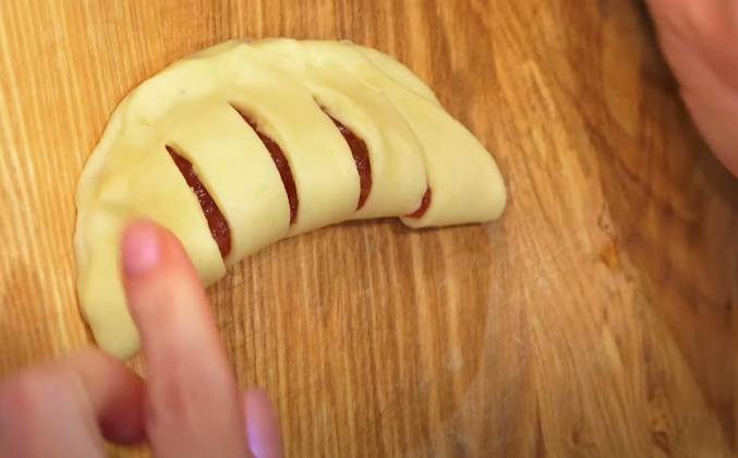 3. Визуально разделяю кружочек на две части, в одной делаю надрезы, но не до конца. В середину выкладываем начинку. Одной стороной тесто накрываем и защипываем края. Точно так делаем и другие. [формируем печенье] И ставим в разогретую духовку до 180 градусов на 20 минут, но все зависит от особенности вашей духовки.Видео рецепт ютуб ниже 👇