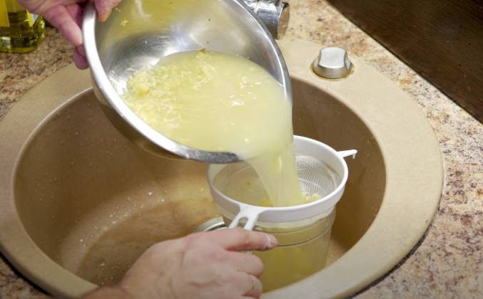 2. Как раз за это время у нас немного остынет вода. И мы можем добавить мед с лимоном. Мед не рекомендуется кидать в кипящую воду, да и вообще в принципе нагревать, поэтому подождем, пока вода остынет примерно до 50-60С. Примерно через 5 минут сюда же в миску можно выжать целый лимон. Опять-таки можно не переживать из-за косточек. Если падают, пускай падают. Весь этот напиток мы будем процеживать. Добавляем сюда 2 столовые ложки меда. И хорошенько всё это дело перемешиваем до полного растворения меда. Мед растворился. Ну и сейчас этот напиток необходимо процедить.