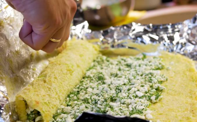 2. Сейчас ей необходимо дать 10 минут остыть, и потом уже можно будет заворачивать начинку. Ну, а пока у нас есть время, чтобы приготовить начинку. Из творога я отжал лишнюю жидкость прямо в пачке. К творогу отправляем остатки сыра и нарезаем свежую зелень. Перекладываем зелень и хорошенько всё это дело перемешиваем. Основа подостыла. И теперь она будет намного проще отходить от фольги. Ну, а вообще, конечно, для этого рецепта идеально использовать бумагу, потому что к фольге, конечно, основа прилипает. Я вот так прошелся по периметру деревянным ножичком, так сказать, освободил края. Сейчас выложу начинку и буду потихоньку заворачивать. Начинку я выкладываю не до конца. Я оставлю здесь небольшое свободное пространство, чтобы рулет у нас закрутился. Ну и теперь самый ответственный момент. Я надеюсь, что фольга меня не подведет, и у нас все получится.