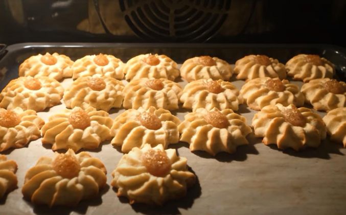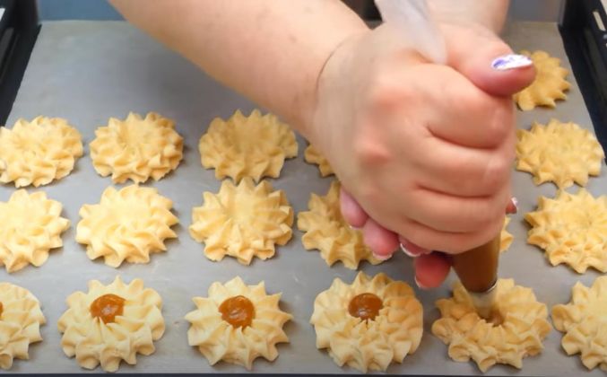 3.  Думаю, вам тоже пригодится моя подсказка!) Отсаживаем печенье на небольшом друг от друга расстоянии. Если выкладывать тесто, держа насадку повыше от противня, тогда готовые печенья будут более объемными, а если хотите получить тонкие практически плоские печеньки в виде цветочка, то держите насадку пониже, ближе к противню и отсаживайте тесто понемногу тонким слоем. По центру печенья делаем углубления и заполняем их густым джемом, повидлом или укладываем очищенный орех фундук у меня домашнее яблочное повидло, при выпечке оно прекрасно себя ведет и не растекается. Противень отправляем в духовку, разогретую до температуры 220°C и выпекаем на режиме верхний и нижний нагрев без конвекции в течение 15-17 минут. Время выпечки будет зависеть от размера печенья, количества противней и особенностей вашей духовки. Готовые печенюшки достаем, даем им остыть и можно всех звать на чай!Видео рецепт ютуб ниже 👇