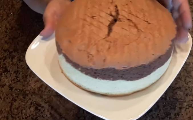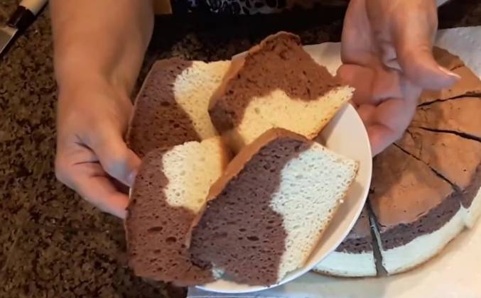 5. Итак, будем переворачивать. Сразу и белая пышка и коричневая. Можно не возиться, просто разрезали и все. Вот такой вот он получился замечательный. Все очень легко и просто замечательно, очень нежный бисквит, что я даже боюсь его трогать чем он мне нравится? Тем, что он очень нежный, очень воздушный, он всегда получается очень высокий, пышный, прекрасный бисквит. Он никогда не опадает, никогда не подводит, и очень хорош в тортах. Во всех тортах. Единственно только нужно подобрать правильно крем, потому что бисквит сам по себе нежный, и крем к нему должен быть очень нежный. Не тяжелый. И хотя говорят, что вот если допустим присутствует масло, то это уже не бисквит, а кекс. Пусть это будет кекс, я соглашусь, но это вкусный кекс. А кто хочет классический бисквит, пожалуйста пеките классический бисквит. Сейчас он остынет, я его разрежу, покажу внутренности. Что уж бисквит еще не совсем остыл, но я попробую все таки его нарезать. Конечно, в идеале, чтобы он настоялся хорошо, и только затем его разрезать.Видео рецепт ютуб ниже 👇