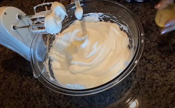 2. Теперь это тесто нужно разделить на пополам примерно. Тесто я разделила на две части визуально. В одну часть нужно добавить какао порошок, все хорошо размешать. И так, у нас получилось 1-я часть белое тесто, другая часть темное, шоколадное, это тесто пока мы оставляем сторону. Сахар я добавляю, ванилин. Если у вас экстракт ванили добавляйте его в желтки, и приступаю ко второй части теста, к взбиванию белков. Я их взбила в такую хорошую - хорошую мыльную пену. Теперь я высыпаю сюда сахар, и продолжаю взбивать до тех пор, пока сахар полностью растворится в белках, чтобы это проверить, просто между пальцами потрете, если не будет чувствоваться сахар, значит белки готовы. Белки взбиваем в очень пышную устойчивую массу, в середине взбивания добавляем чайную ложку лимонного сока и продолжаем взбивать до конца вот такие получаются крепкие устойчивые белки видите которые держатся на лопатке и не падают.