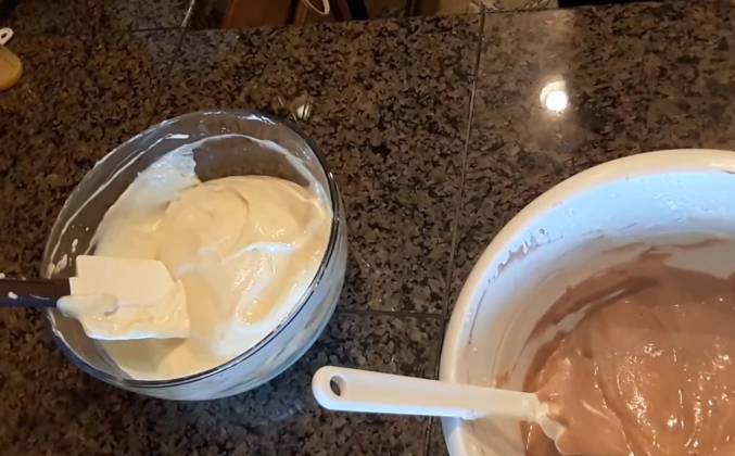 3. Белки также делю напополам и добавляю в эти обе части теста, в белую и коричневую. И хорошо смешиваю с тестом. Белки нужно аккуратно, медленно вмешивать. Белки я смешала с шоколадным тестом, теперь сюда добавляю оставшиеся , и также нужно хорошо все перемешать. Белки нужно вмешивать аккуратно, но не долго. Все хорошо перемешано, теперь я выливаю тесто в форму. Сначала идет белое тесто, аккуратненько нужно его расправить, теперь коричневое, шоколадное тесто также аккуратненько сверху расправляем, теперь нужно палочкой круглой лили вот, в данном случае, буду ручкой делать от лопаточки вот такие вот кружочки, рисунки, я не знаю как это назвать, в общем вот такие вот движения. Аккуратно. Все, духовка уже нагрелась. Как я сказала, ставлю на температуру 160 градусов Цельсия, или 320 градусов фаренгейта на 10 минут, затем убавляю температуру на 130 градусов Цельсия, или 260 градусов фаренгейта, и выпекаю ещё 35-40 минут, так ,посмотрим, что у нас тут получилось.