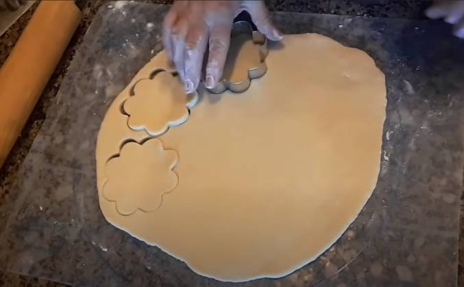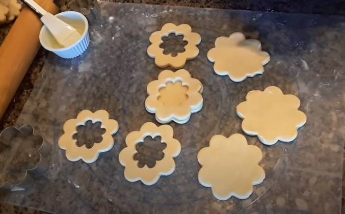 3. Охлажденное тесто делю на две части и раскатываю в шириной 5-6 миллиметров вырезаю заготовки произвольной формы и размера одну половину заготовок оставляют целыми во второй половинки вырезаю середину целые заготовочки по краю смазываю белком и укладываю сверху заготовочку с вырезанной серединой делаю таким образом вот такую корзинку эти корзинки в помощью лопаточки укладываю на подготовленный противень вот таким образом и так все остальные заготовки. Вверх заготовочек смазываю белком если у вас в начинку идут какие-то сочные ягоды можно также серединку смазать белком это будет своеобразная защита от вытекающего сока теперь можно укладывать ягоды внутрь можно также джем сюда положить, или варенье густое, сверху посыплю крупным сахаром, ставлю в разогретую духовку как я сказала 190 градусов по Цельсию и триста семьдесят пять градусов по фаренгейту, на 15-20 минут, смотрите по своей печке. До готовности.Видео рецепт ютуб ниже 👇