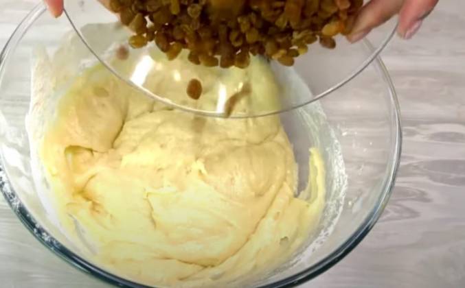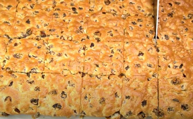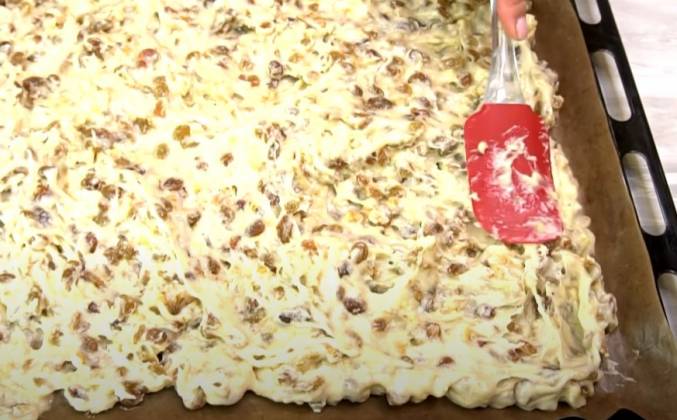 2. Все перемешиваем до однородности. Теперь добавляем изюм и орешки, все перемешиваем. Берем противень стандартный от духовки у меня размером 30 на 40 см Кладем тесто и равномерно распределяем. Ставим в разогретую духовку и выпекаем при 180 градусах 20 минут, или ориентируйтесь по своей духовке.