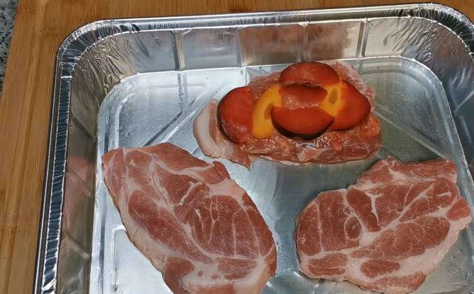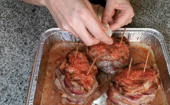 2. Теперь я буду укладывать 3 кусочка мяса на дно. Каждый кусочек мяса мы смазываем соусом, который сделали. Я вам покажу на одном кусочке, но делаем так со всеми. Выкладываю морковочку и укладываем обильно сливу. Накрываем кусочком бекона и сверху кладем следующий кусочек мяса. И так слой за слоем три слоя. Такие пирамидки у нас получились. Теперь укладываем последние кусочки мяса сверху и в двух местах это мясо протыкаем шпажками.