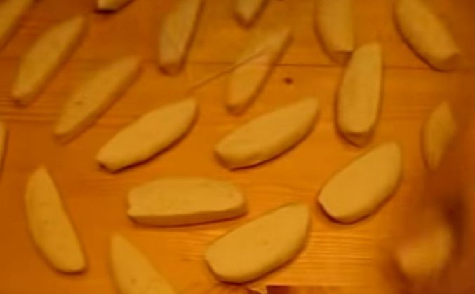 3. Тем временем, скатала из теста жгут. Диаметр жгута зависит от того, какие печеньки вы хотите в итоге получить: маленькие, побольше, либо очень большие. Тесто делим желательно на равные кусочки - столбики. Я оставлю на столе только то тесто, с которым буду работать, а все остальное соберу в миску, и пока уберу в холодильник. Не будет два противня - печенье я буду выпекать по очереди, поэтому половину теста в миске убираем, а половину подготовленного теста я буду раскатывать. Рассказывать можно разными способами.