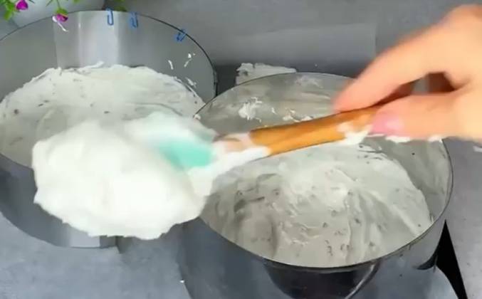 4. Отделить 1/3 часть крема и 3 ст.л.⠀ В 1/3 часть крема добавить како и хорошо перемешать.⠀ На корж нанести белый крем. Накрыть вторым коржом. На верх и бока торта нанести шоколадный крем.⠀
