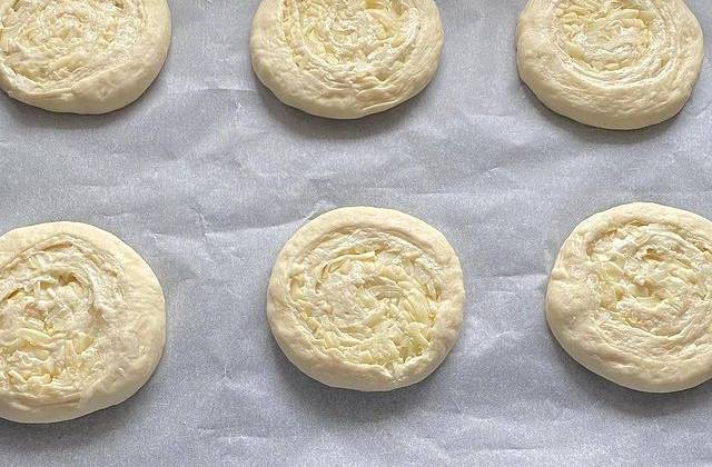 4. Далее каждую заготовку прижать ладонью или раскатать лепешку, толщина 1 см. Заготовки разложить на противень, застеленный бумагой для выпечки, накрыть пленкой, дать подойти около 20 минут.