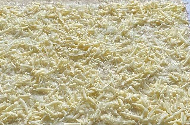 2. Сыр натереть на крупной терке. Но! Как вариант лук можно обжарить! Как тесто подойдёт, раскатать его в прямоугольный пласт , ширина раскатки 0,5 см. Если тесто липковатое, пользуйтесь мукой. Пласт теста смазать размягченным сливочным маслом не доходя до края 1,5 см. Разложить начинку: сначала лук, затем сыр.